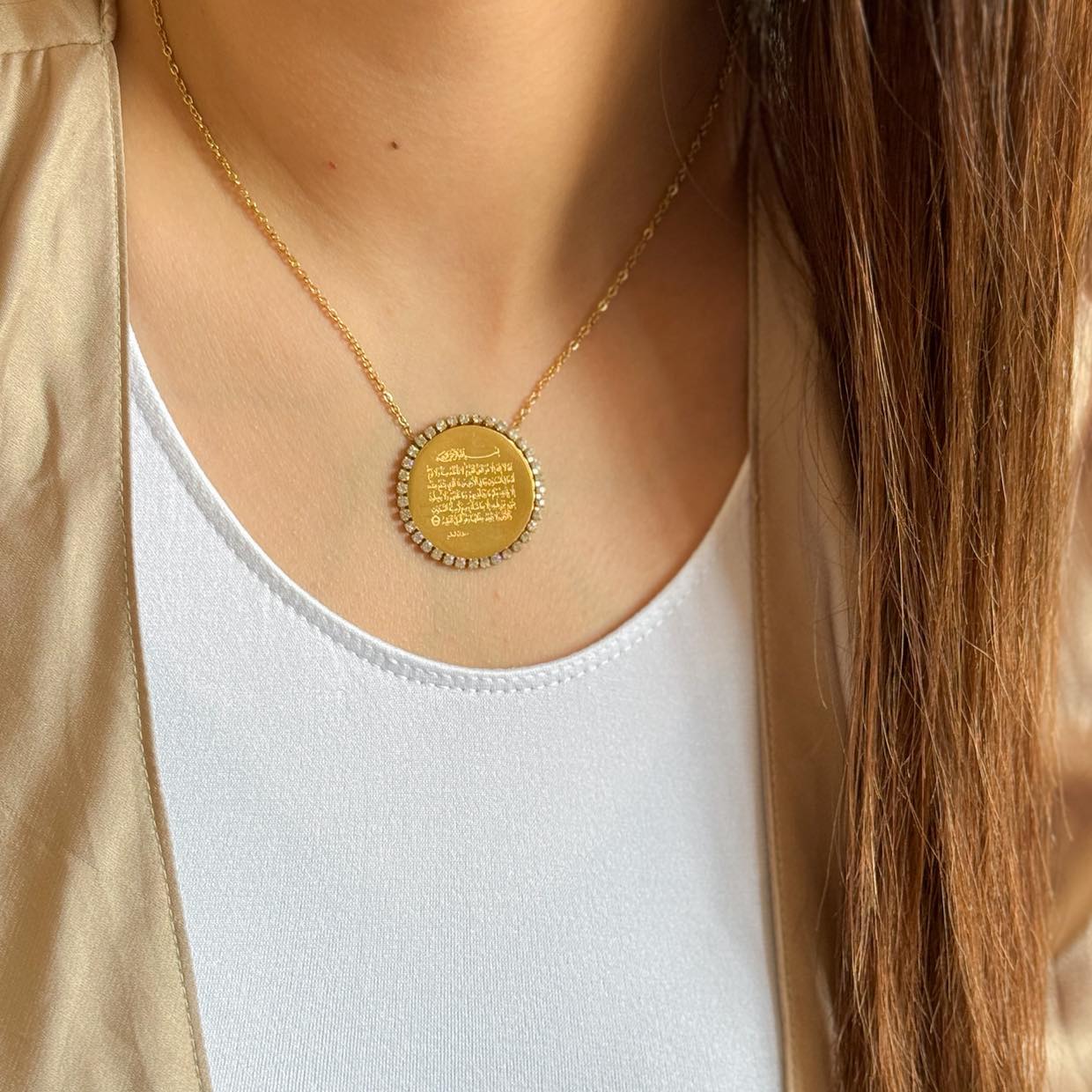 تتميز قلادة آية الكرسي بقلادة بيضاوية متلألئة مرصعة بأحجار تشيكوسلوفاكيا، مثبتة بشكل مثالي على سلسلة متينة من الفولاذ المقاوم للصدأ من أجل سحر يومي وأسلوب ذو معنى.