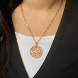 The Flower of Life Necklace features an ancient geometric symbol recognized across cultures for its sacred significance. This timeless pendant showcases the interlocking circles that form the iconic pattern, believed to represent the fundamental forms of space and time. Crafted with attention to detail, it serves as both a meaningful spiritual accessory and an elegant statement piece. Perfect for those drawn to sacred geometry, metaphysical symbolism, or simply appreciating distinctive jewelry design. A versatile addition to any collection that bridges spiritual intention with contemporary style.