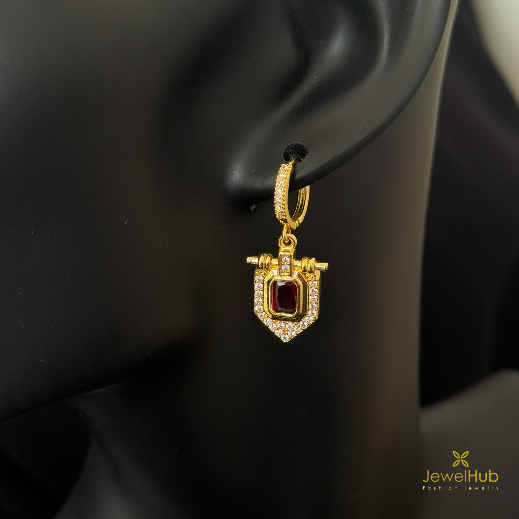 Crimson Shield Earring These striking earrings command attention with their bold geometric design and rich crimson hue. Crafted with precision, each piece features a distinctive shield silhouette that balances contemporary aesthetics with timeless elegance. The deep red tone complements a wide range of skin tones and wardrobe choices, making them versatile enough for everyday wear or special occasions. Whether you're seeking a statement piece to elevate a neutral outfit or a confident accessory that reflects your personal style, the Crimson Shield Earring delivers both artistry and wearability. A refined addition to any jewelry collection.