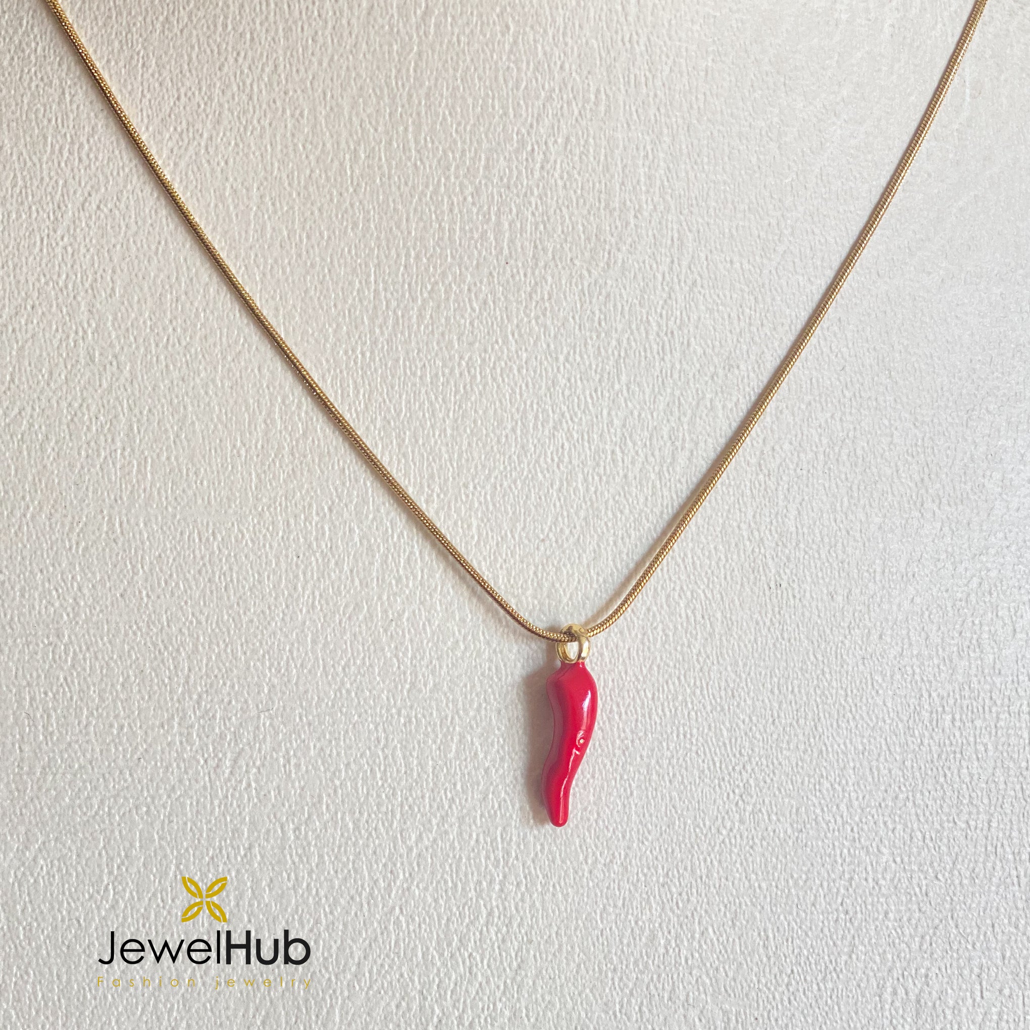 Red Chili Necklace A striking pendant necklace featuring a meticulously crafted red chili charm, perfect for those who appreciate bold, statement jewelry. The vibrant crimson design captures the essence of culinary passion and adds an unexpected edge to any ensemble. Ideal for food enthusiasts, spice lovers, or anyone seeking a conversation-starting accessory that blends artistry with personality. This piece works beautifully as a standalone statement or layered with complementary chains for a curated look.