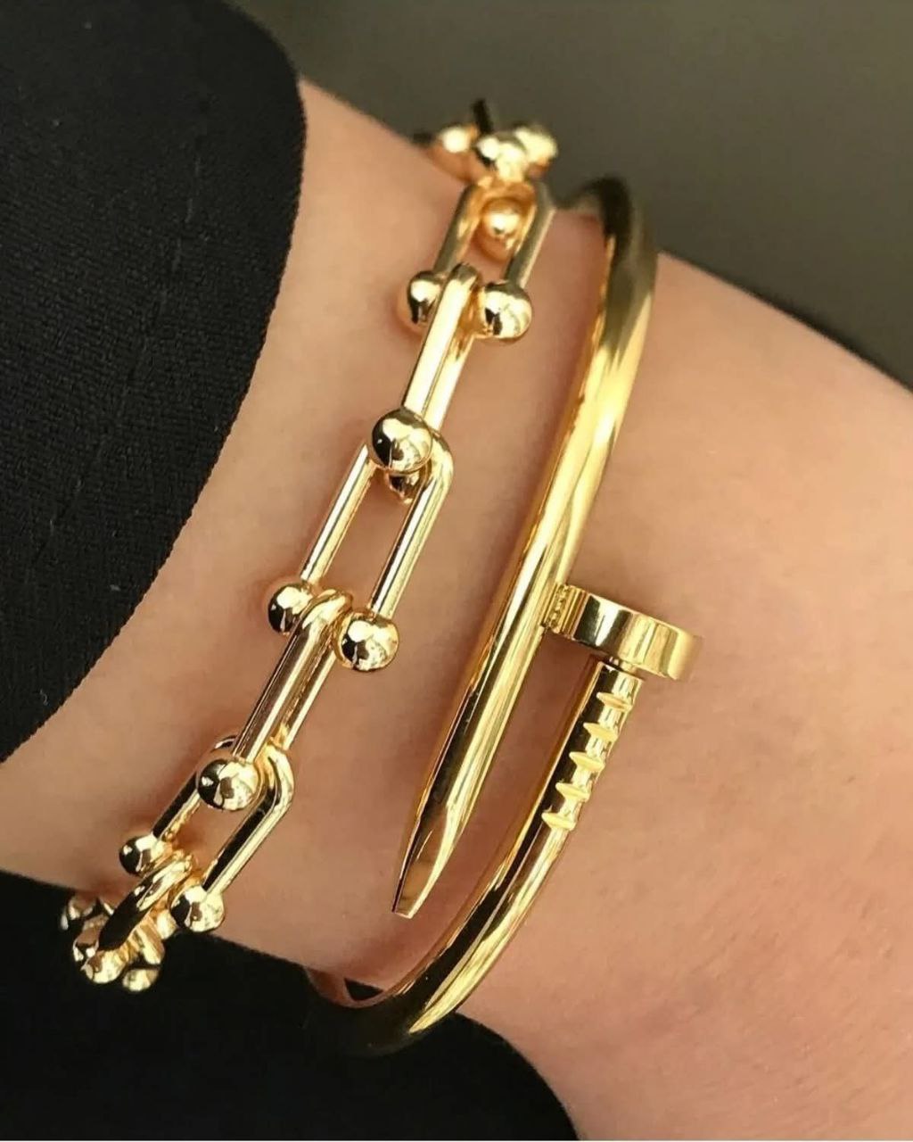 Crafted with durable stainless steel, the Golden Set includes a stylish bracelet that is perfect for any occasion. Its sleek design and high-quality material make it a must-have for any fashion-forward individual. Elevate your look with this elegant and versatile accessory.
